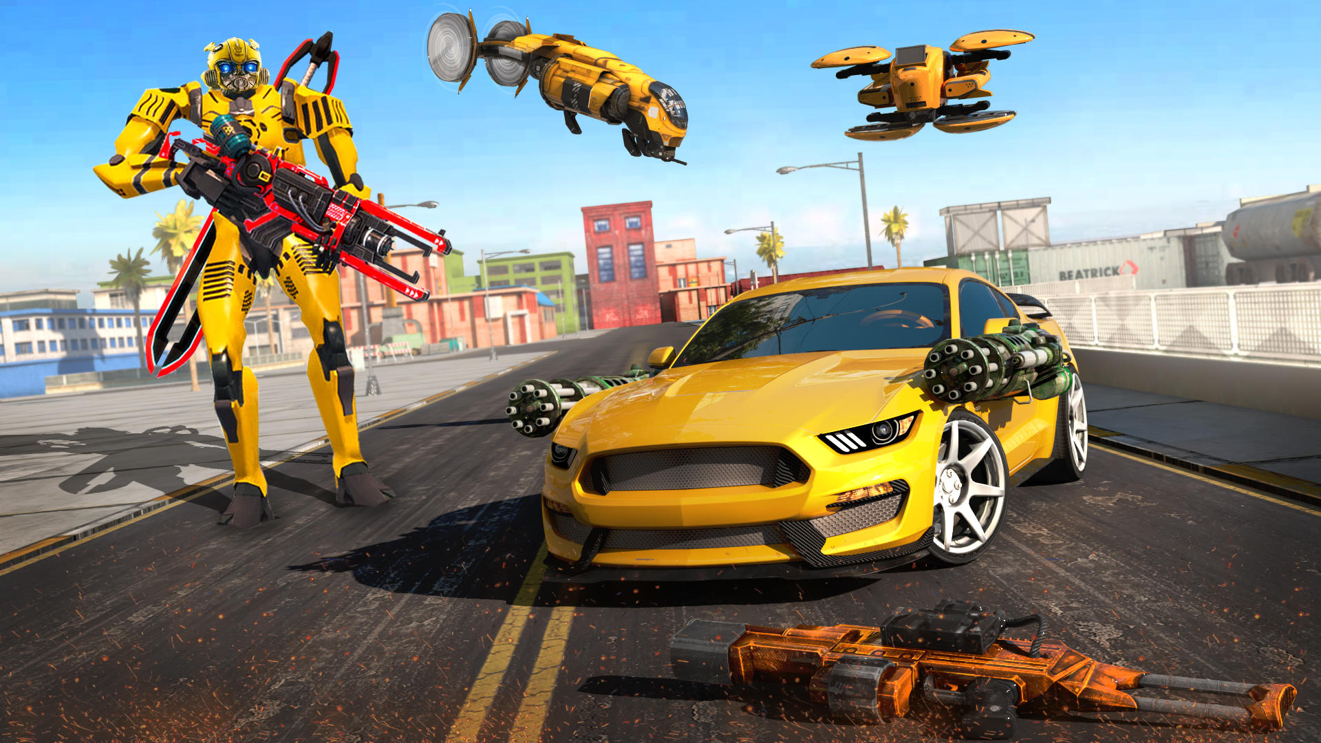 In This modern arena fighting game we are going to give you the jetpack robots from which you can fly with the help of the robot jetpack in the flying robot game. In This transforming robot game you can see the most advanced and highly detailed robotic vehicles which can transform their bodies into heavy combat fighting robots. In nerf and war players can control their robots with specialized smooth controls. In robot battle you have to clear the enemy robots with your special dragon robot. In a robot flying game you can fly into the air by just transforming your robot into the dragon robot flying mode. You can also participate in the Alien Robot festival held on the planet of apes. The power rangers can help you to guide the route of the Alien robot festival. In a world of war go with all the transformation robots and fight with the giant robot of the aliens and beat them with your special robotic weapons either you can also transform into the space armored robot and can travel all over the space. Air robot game is here with all the thrilling adventures of the robot rage and robotic drones dogfights. In the futuristic robot battle we give the 3d robots to give the most advanced technology vibe by adding the tank robots walking on the road along with the power rangers. In the Advanced steel robot boxing during the combat and the bot fighting you can use the hidden moves to defeat the evil robots.