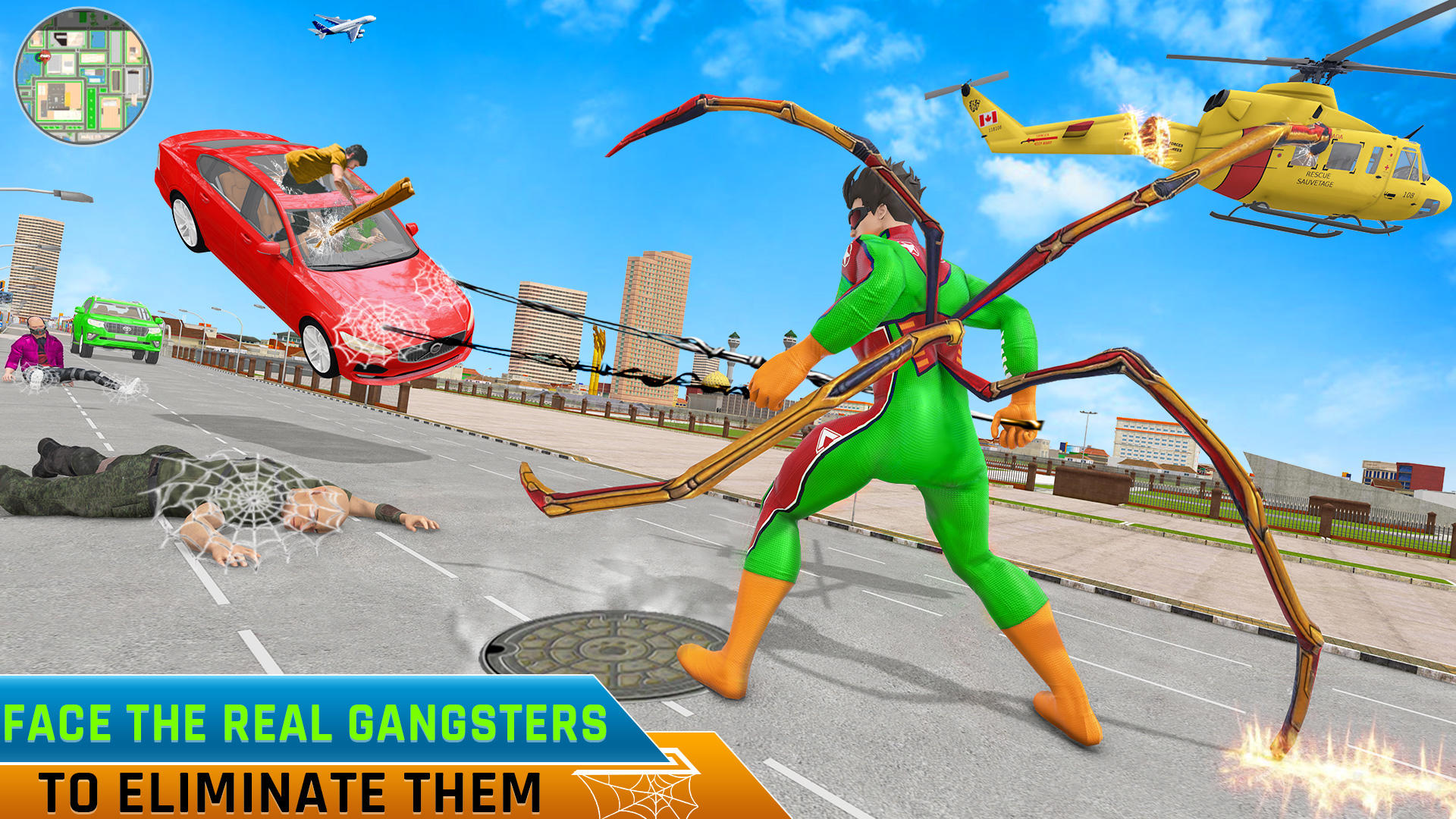 In this flying rope hero game and real gangster crime simulator game you are leading the squad of survival team to face all unacceptable forces. Land into the battlefield of spider rope hero games to eliminate gun shooters of real gangster games & amazing superhero games. Be the brave rope hero and get all about crime city wars, big city robbers, car snatching games, and octopus crime city in spider games.