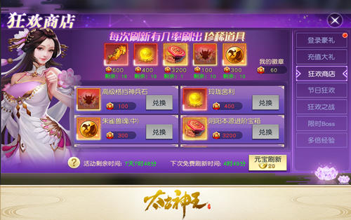之前的活動中相信大家都已經收集了不少徽章,等到明天(10月1日)狂歡商店正式開張後,就可以用徽章購買各類稀有禮品了。除了高級格擋神兵石、朱雀獸魂(中)等可以大幅提升戰力的稀有材料外,還有諸神篇新神器“九霄鼎”激活道具、紅色靈寶、強力魂將“斬塵”碎片等極品珍寶,只要你有徽章老闆就會統統揮淚奉上!