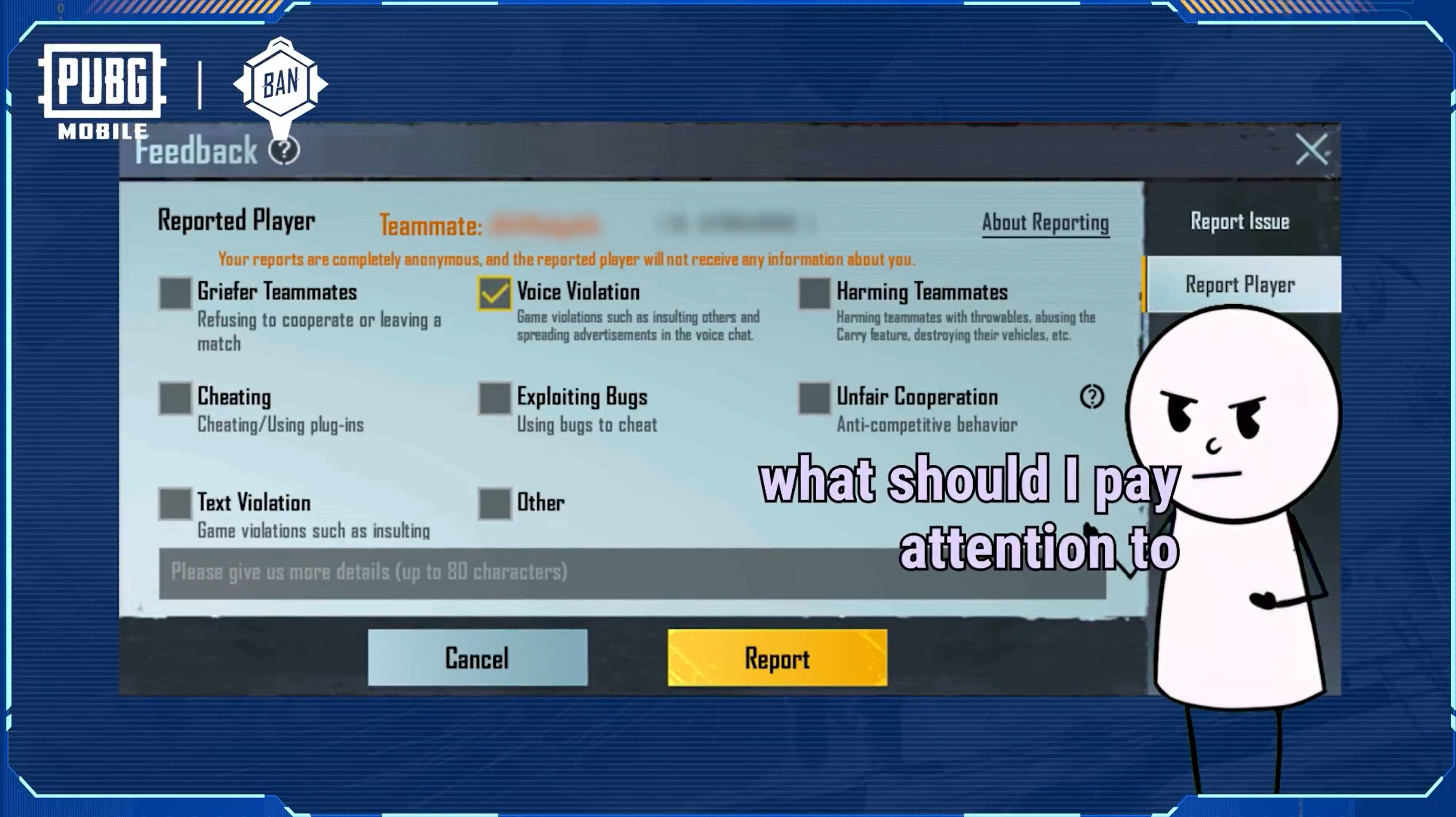 Third, don't just rely on voice reports. If someone is cheating, report them for cheating instead of voice violations. The security system has different protocols for different types of reports, and cheating reports have a higher success rate.