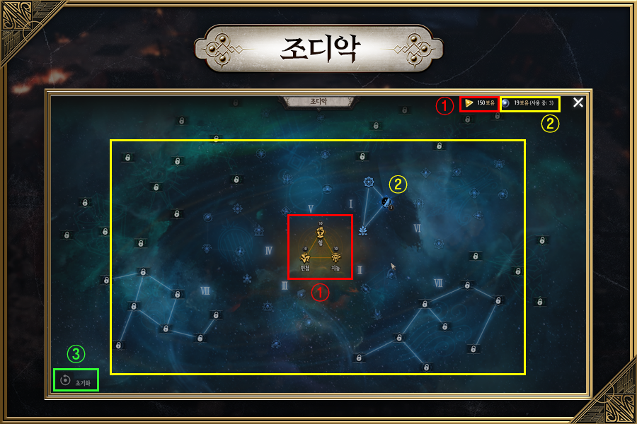 - In a constellation, there are nodes with different effects such as melee, ranged, and spell, and you can change the node you want to increase the characteristic by pressing the left and right arrows.