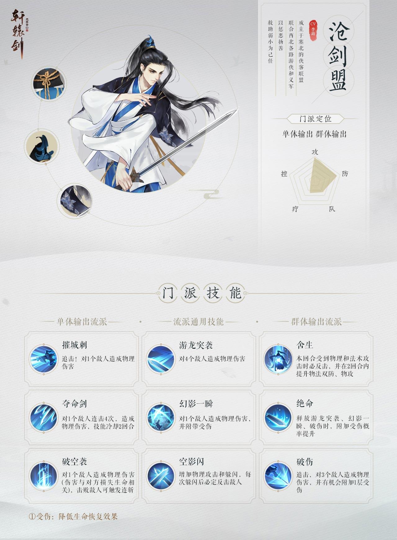 滄劍盟憑藉高超劍技威震江湖,在攻擊與防禦兩個屬性上,都有著較大優勢。門派技能主要分為單體輸出與群體輸出兩個流派,準確判斷作戰形勢,激活相應流派,方能技驚四座,所向披靡。