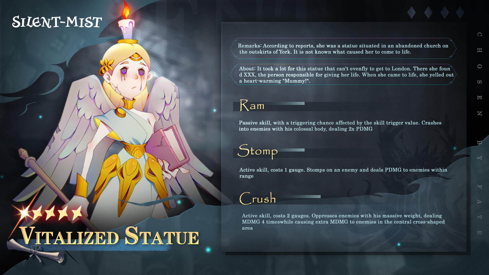 [Remarks] According to reports, she was a statue situated in an abandoned church on the outskirts of York. It is not known what caused her to come to life.