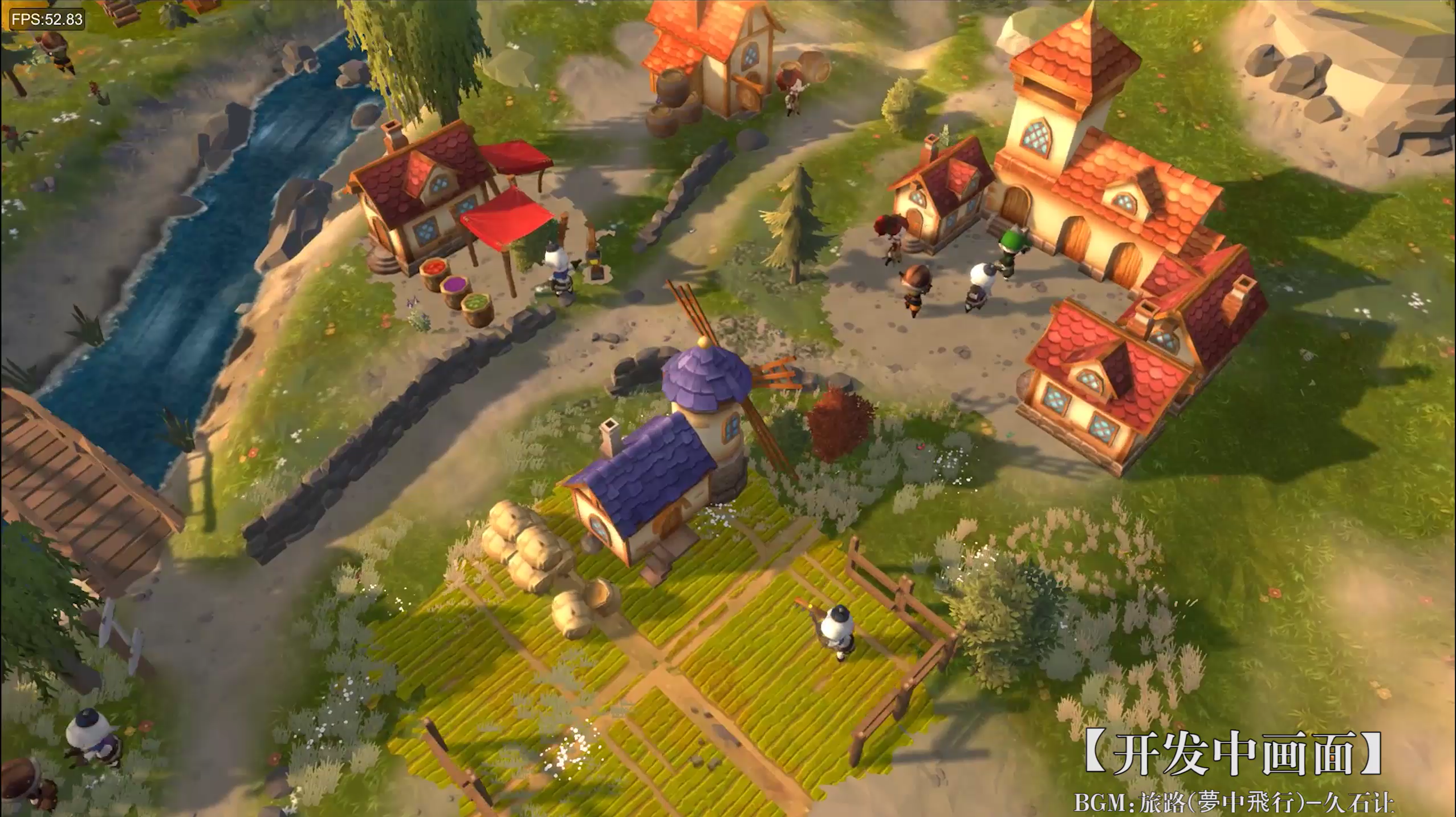 00:15-00:18,城鎮的俯瞰視角,大哥偷懶只造了幾種建築,我能辨認出的是農莊,染坊,市政廳,還有個小小的房子是旅人的居所。所有建築是動態的,比如農莊里風車會轉,當然地裡種的農作物也會慢慢成長到收割,只不過視頻這點時間不夠長熟。