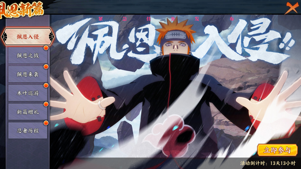 活動內容:佩恩新篇主題活動包含七大活動:佩恩入侵劇情任務,佩恩之戰,強者試練“天道”,木葉巡遊、新篇贈禮,忍者歷程,感恩回饋。