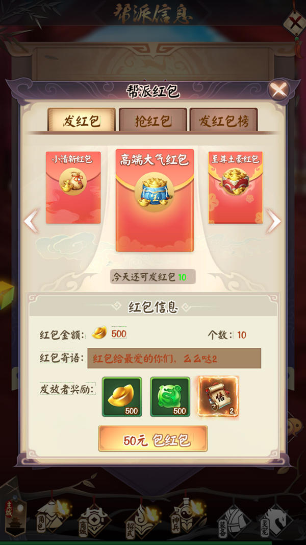 為了幫派的繁榮發展,需要每位幫眾的共同努力,每天都可以在資財界面捐獻幫派貢獻,提升幫派經驗值,助攻幫派升級。而除了共同奮鬥的幫派副本,幫派福利也必不可少。在幫派界面選擇發放紅包,即可為全幫發放福利!至尊土豪紅包、高端大氣紅包、小清新紅包等多款紅包任你選擇。