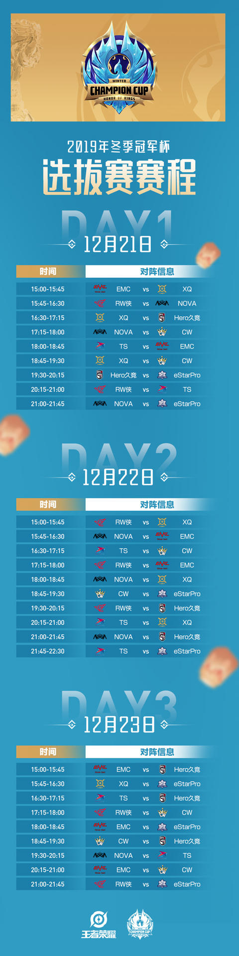 隨著2019年KPL秋季賽總決賽的落幕,2019年KPL、KRKPL的秋季賽都已全部結束。但戰鬥仍未停歇,2019年王者榮耀冬季冠軍杯即將開啟! KPL賽區秋季賽前三戰隊AG超玩會、QGhappy、DYG.JC與KRKPL賽區秋季賽前三戰隊SLT、GOG、ROX已確認直接晉級冬季冠軍杯,而冬季冠軍杯剩下的兩個名額則將通過冬季冠軍杯選拔賽決出。