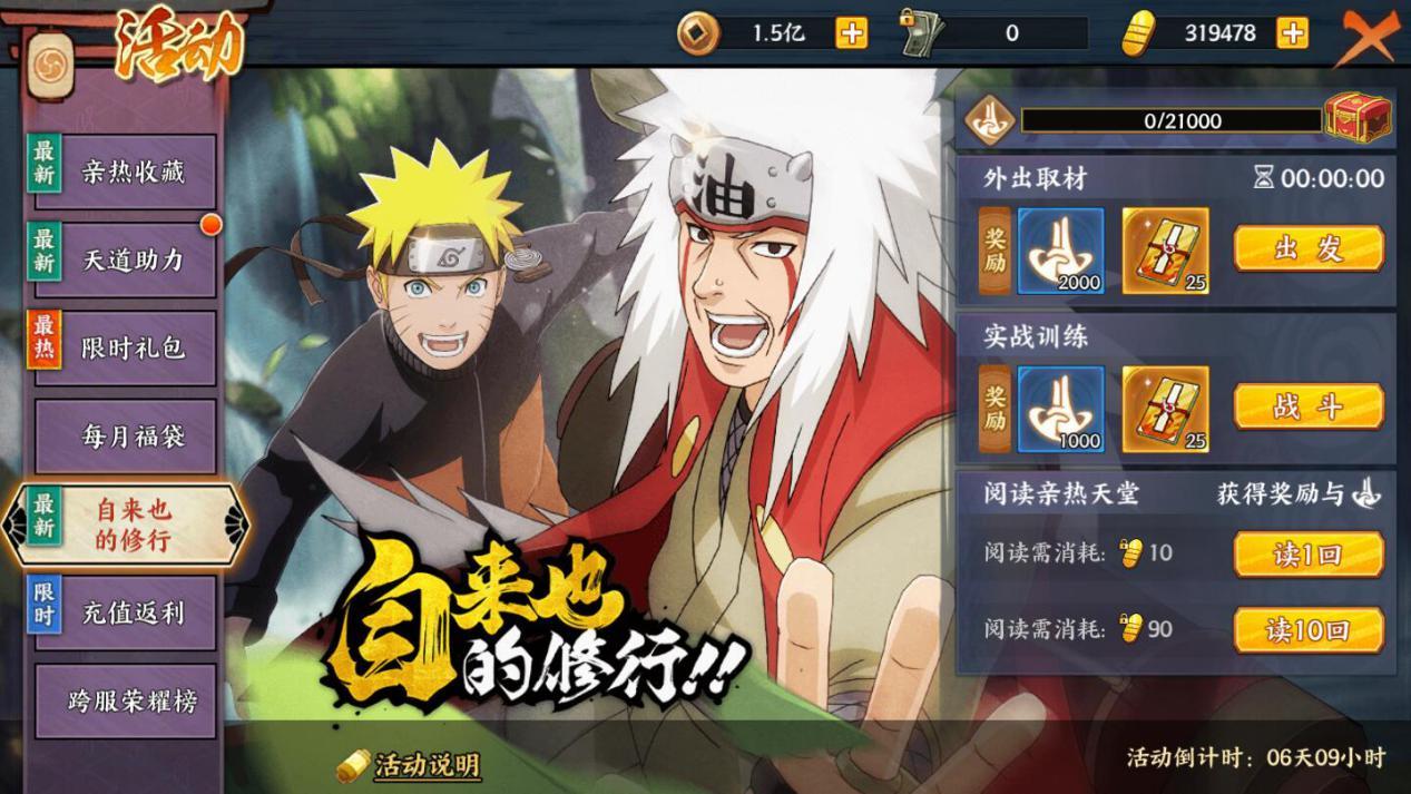 活動說明:唯有不斷修行才能變強,活動期間跟隨自來也老師進行修行,修行可以獲得修行值,修行值達到指定數量可以獲得通行證經驗、修行靈玉等獎勵。