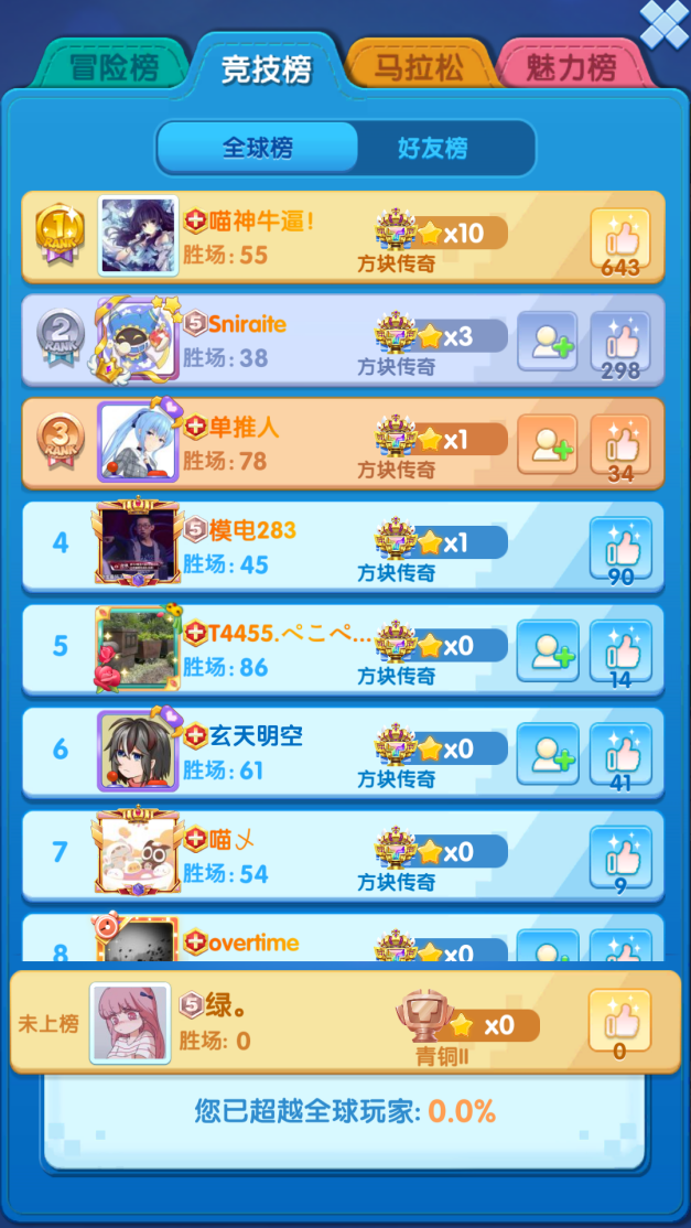 天梯賽是七塊兒最喜歡的比賽,沒有高顏值你別玩。這次 QQ服務器榜排在第一位的是“瞄神牛逼!”,炸裂感爆棚的名字出色的技術,讓他勝利高達52場,獲得6星方塊傳奇段位;第二名的“Sniraite”以勝利38場,獲得3星方塊傳奇段位;而第三名的“單推人”以勝場78,成功晉級1星方塊傳奇段位,但“單推人”還是馬拉松榜上榜高手,身兼二職實力不是一般強。