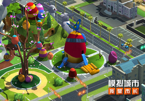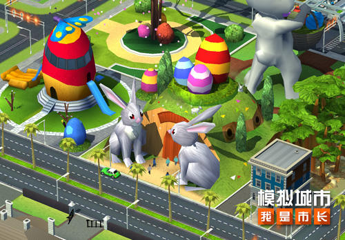 《模擬城市:我是市長》的卡通樂園建築多以小兔和彩蛋為主要元素,而名為籃子小兔的公園便以巨型的兔子雕像為主體。值得的一提的是,小兔的手裡還提了盛滿彩蛋的竹籃,彷彿要將美好的春天作為禮物送給大家。
