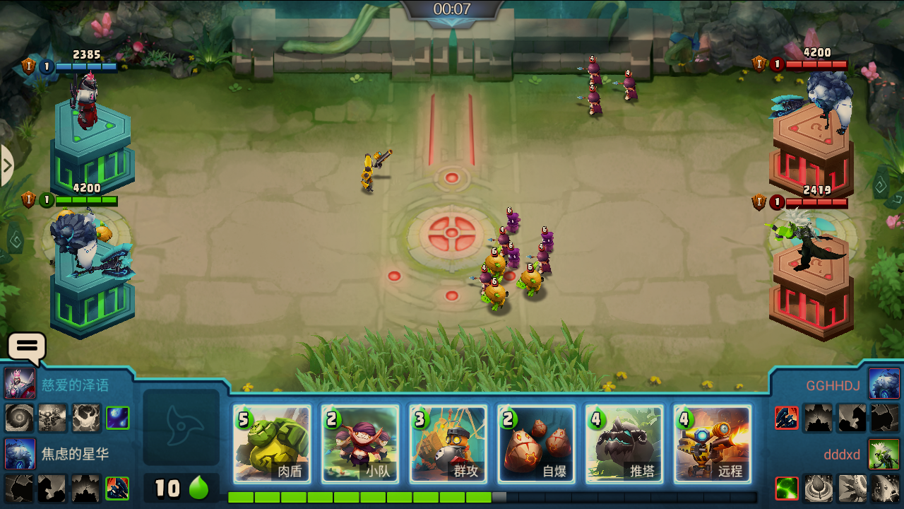 進入戰鬥後,場景和玩法與目前的排位賽是一致的,不一樣的是英雄的站位不一致,從一人一邊變成了兩個玩家站在一邊,然後玩家就可以用自己選擇的兵種,出兵進行戰鬥啦!