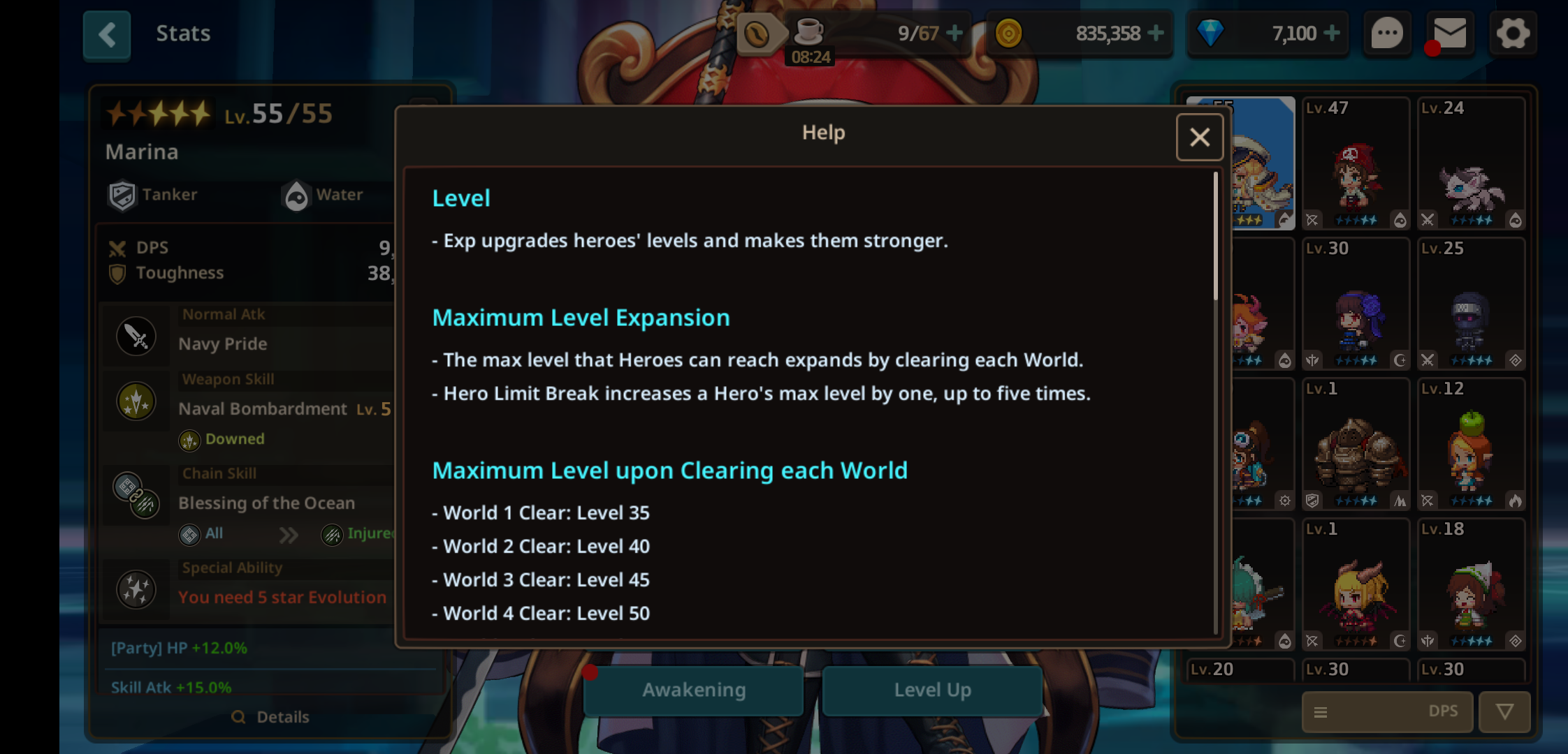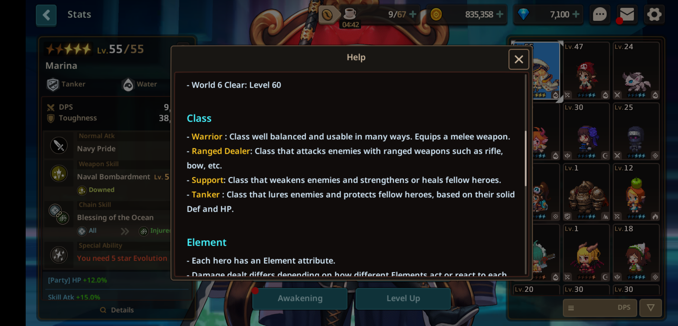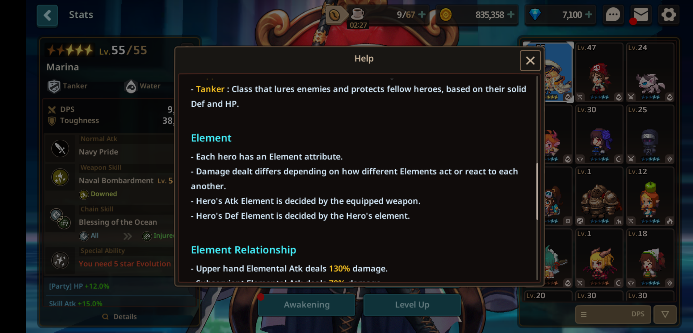 等级:目前游戏等级最高65级,通关主线6图达到60级上限,英雄突破五次达到65级上限。英雄定位:战士,范围输出,辅助,坦克。英雄元素:英雄攻击伤害的元素由武器决定,角色对元素的防御由英雄自身元素决定。元素克制关系克制会导致增伤至130%和减伤至70%。火克土,土克水,水克火光克暗,暗克原力,原力克光。如果英雄元素与其装备武器元素一致,有10%攻击加成。武器技能英雄技能由武器技能决定,武器技能会造成3种异常状态之一,绿色重伤,蓝色击飞,黄色击倒。武器品质:白色,蓝色,独特红,传奇金,精英绿。武器与角色一样有6中元素,并且决定英雄的攻击伤害元素。武器图标右上角有橙色旗子标记为英雄专属武器。专属武器只存在传奇金和精英绿中。专属武器存在只对其专属英雄生效的强化。武器星数不代表任何品质强度,抽到五星与四星武器没有本质区别,武器池存在同一把武器的四星和五星。武器存在随机属性词条。链式技能:当敌人处于由异常状态时可使用链式技能。英雄可以从觉醒中学习他们独有的链式技能。每个链式需要敌人在特定的异常状态时启动,并且链式技能本身会造成链式异常状态。总的来说,敌人在特定的异常状态时会启动英雄的链式技能,链式技能会使产生新的异常状态。新的异常状态会启动其他英雄的链接技能。链式技能的使用:当队伍中的四个英雄配置恰当时,你可以启动链式技能达到四次。链式技能需要敌人在异常状态下才能启动。有些链式技能能够被启动而无视敌人异常状态的种类。如上图中间的链式技能,绿色重伤图标代表这个链式技能需要敌人处于重伤异常状态下才能启动,而与绿色重伤图标链接着的黄色击倒图标代表链式技能启动后会对敌人造成的异常状态。如上图中间的链式技能,灰色图标代表链式技能只需要敌人在任何异常状态下就能启动。补充说明:链式技能首次启动所需敌人的异常状态一般由队长即玩家控制角色的武器技能攻击敌人产生。团队加成:每个角色图鉴属性下方都有属性加成,其中Party属于团队加成,四个队员各自的团队加成同时生效。英雄进化:英雄使用进化石进化到下一星级,进化能提高英雄基础属性,同时会开启新的觉醒树。进化石可从进化地下城、任务、或者商店兑换获取。突破:英雄进化至五星后可进行等级突破,并开启突破觉醒树。