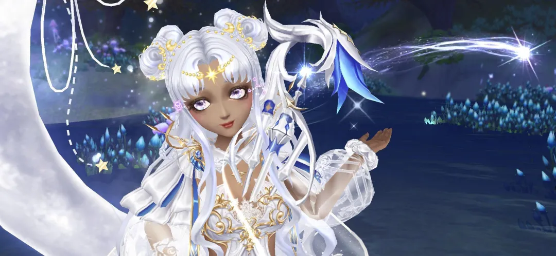 奇幻森林,夢遊仙境!月神魔女身穿純白魔法裙行走於月光之下,潘多拉的魔法力量在指尖凝聚,揮動手中的元素魔杖,只為開闢一片全新的魔法大陸~