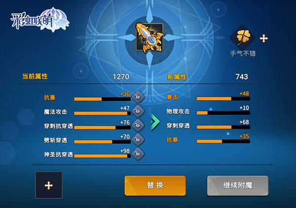 這是一個完全看人品的玩法,當然對自己的運氣並不是很自信的勇者也可以選擇在商城中購買四葉草、兔子腿等道具來增加附魔的幸運值喲~