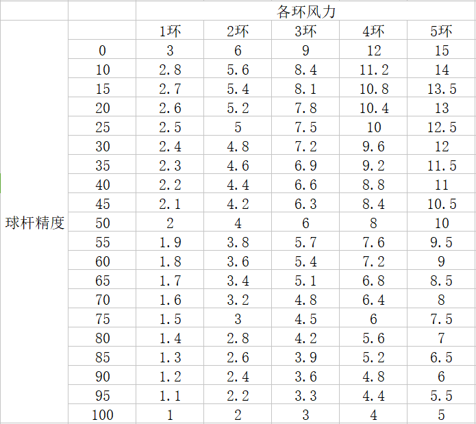 舉例,如果你的球桿精度是66,那麼你使用最大距離瞄準時,最外環邊緣對應風力就是8.4。折算每一個環,對應就是8.4/5 = 1.7。所以如果當前你碰到的風是5,那麼就需要向風向相反的方向挪動5/1.7=3個環(注意是外邊緣)。