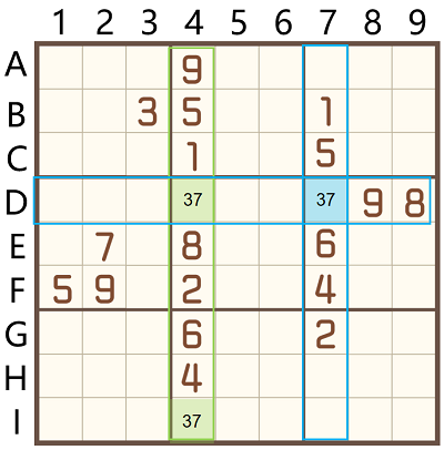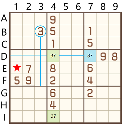 觀察第4列,D4/I4只能填寫3/7,在不確定位置的情況下,填寫候選數,形成數對;