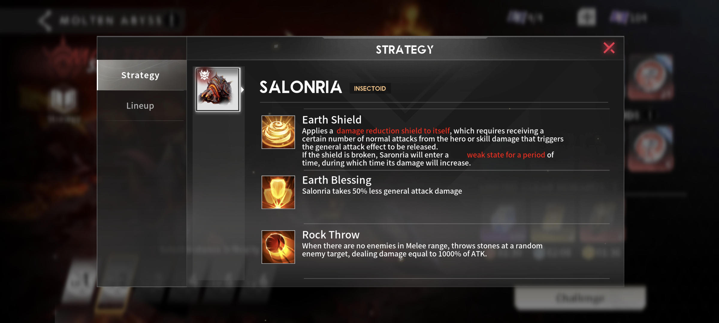 Applies a damage reduction shield to itself, which requires receiving a certain number of normal attacks from the hero or skill damage that triggers the general attack to be released. If the shield is broken, Salonria will enter a weak state for a period of time, during which time its damage will increase.