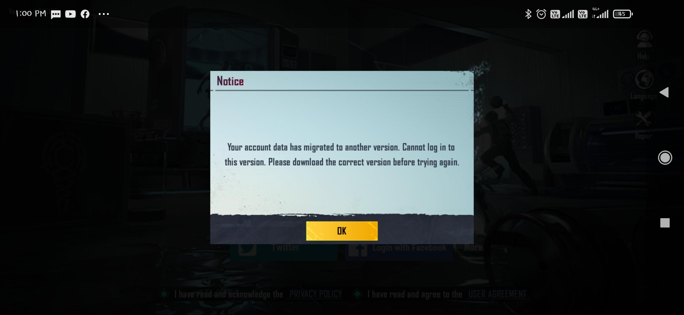 Its because you logged in a different version of game and asked team to transfer you global account data from global to regional version . [ Data transfer's policy : You can't log back to global again with the different version account. ] You have to create a different account(new or any other global account you haven't transfered data to any different version) if u want to login global version .