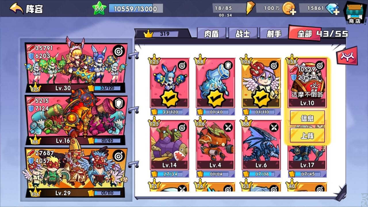 這個時候,打開戰隊,將陣容的三張卡牌位置調整。把板塊中數量、等級最高的射手位置和大力對調,這樣,下一場戰鬥時,肉盾就能足夠多。